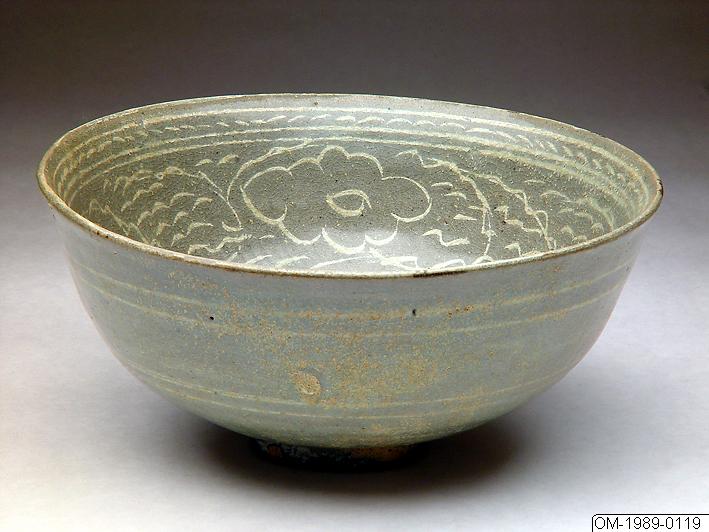 Decorated with inlaid white slip designs and coated in a finely crackled, greenish-tinged glaze, this bowl has a wide mouth, a faintly flaring lip and slanting sides above a narrow foot. The concentric composition in the interior surface of the vessel includes a band of stylized lotus petals, followed by a register of informal, freely rendered motifs, which can be interpreted as stylized flowers, and a band of stylized grass below the rim. The outside is undecorated with only two inlaid double rings in the middle section. Except for the lotus petal-band, which was stamped and inlaid with white slip (Korean: inhwa gibeop), the decoration was incised and inlaid (Korean: sanggam gibeop). The bowl is coated in a greenish-tinged glaze but the surface appears matt and has a gray tone. This bowl was fired on sand. The surface bears signs from overfiring.