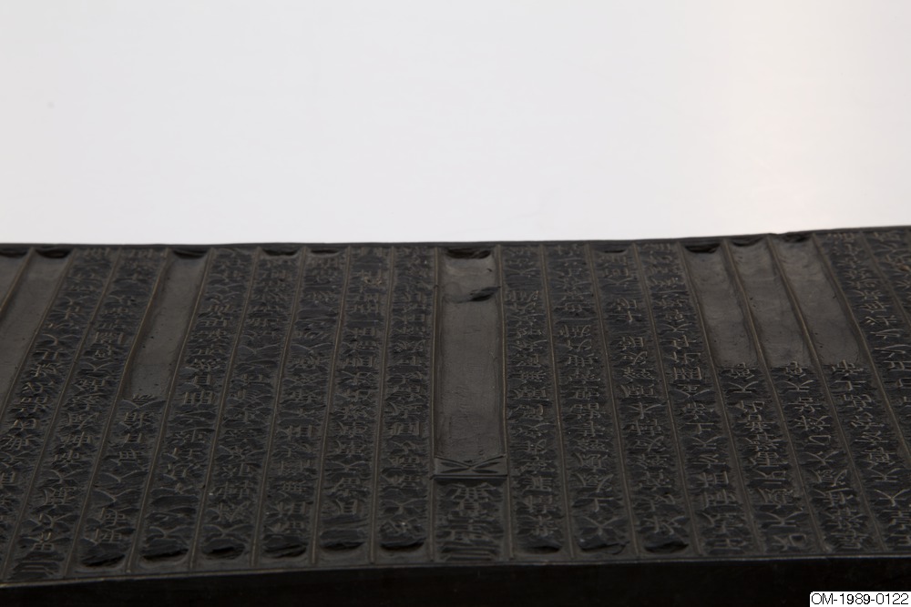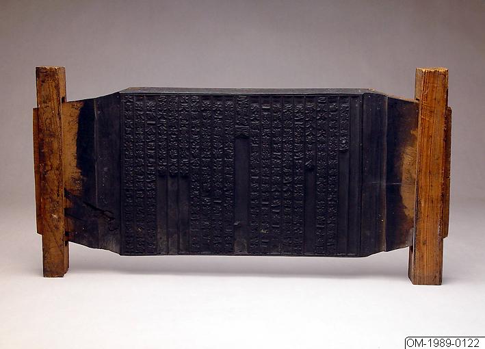 Trästock till tryckning av boken Samsongbo (Kin.: Sansheng baodian, i.e. De tre heliga männens dyrbarheter - Konfucii, Laozi's och Buddhas läror), Tryckstock, trä. Korea. Yi-dynastin. Inköp av Fru Gertrud Sundgren, Ängelholm.