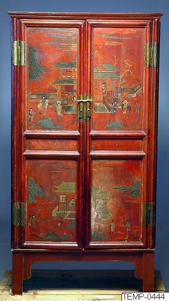 Skåp av rödlackerat trä. På båda skåpdörrarna samt på sidorna finns målade motiv med landskap, figurer och hus. Från möbelmagasinet. Höjd 149 cm, bredd 80 cm, djup 40 cm.