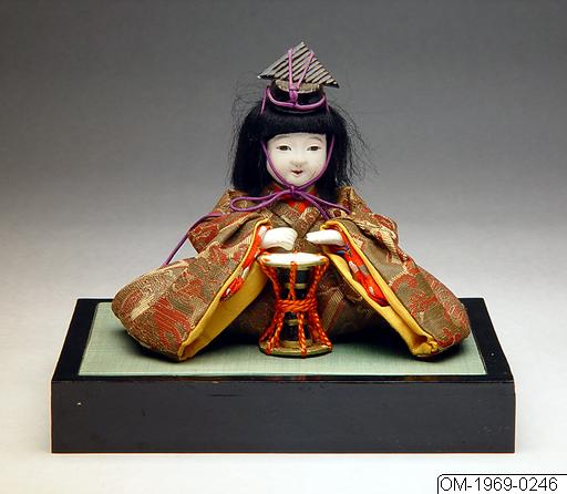 Sittande flicka med lös trumma.15 st. dockor föreställande olika yrkeskategorier. Tillhörande podier och mindre föremål. Kroppen tillverkad i gips (eller något plastliknande) och är bemålad Gåva av fru Stephanie Giesecke 1969. Enligt. förvärvskat. ska dessa ha nr. OM-1969-0235-0266, men de har ingen synlig märkning. Höjd ca. 18 cm inkl. podium Från textilmag