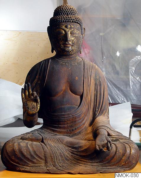 Amida-Nyorai. Amida Buddha sitter med korslagda ben och med fotsulorna vända uppåt. Handställningen symboliserar Amidas nedfärd till jorden för att välkomna själar till återfödsel i den lägsta avdelningen av den övre rangen i Amidas Paradis i Väster (ett sinnestillstånd). Höjd: 85 cm. Bredd: 68 cm. Djup: 49 cm. Från Japansalen, monter 2 mittsektionen.