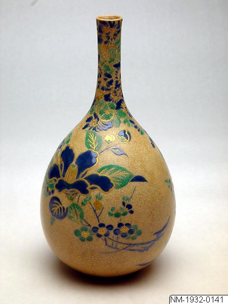 Sakéflaska med blomdekor (bl a kameliablommor) i överglasyrfärger på beige botten. Höjd: 23 cm. Diam: ca.13 cm. Från Japansalen, väggmonter.