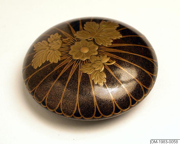 På locket stiliserade krysantemumkronblad. I mitten på locket en krysantemumblomma omgiven av naturalistiska blad, utförda i relief (takamaki-e teknik) i guld.