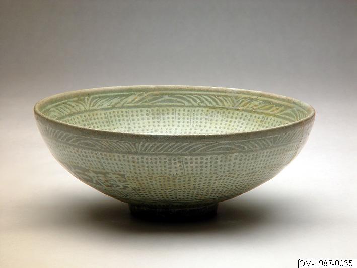 This buncheong bowl with gently curved, slanting sides is decorated with a stamped and inlaid white slip design. The design on the interior of the bowl can be divided into four sections, which are separated by concentric rings. A chrysanthemum flower surrounded by a register with a linear pattern ("ring-punched pattern") and a band of stylized butterflies form the innermost section, followed by the second section with a band of stylized lotus petals. The walls are covered with a wide register of the same linear pattern, and the composition ends with the last section, with a band of stylized "grass" motif along the rim. The design on the exterior surface consists of a grass pattern band below the rim, followed by a wide register of the linear pattern, a band with stylized lotus petals and a band of small chrysanthemum flowers that encircle the bowl right above the foot. Within the linear patterned register on the exterior, there is an inscription inlaid in white slip of five characters: 軍威仁壽府 (Gunwi Insubu). This means that the bowl was produced in Gunwi, in today's Gyeongsang Province, in the southeastern part of Korea, for the government office called Insubu. Thus, it was produced for use at the court. The last two characters 壽 and 府 appear to have been swapped, probably a mistake by a workman who could not read Chinese characters at the ceramic kilns. The bowl is coated with a clear, greenish-tinged glaze. There are marks from four clay pads on the foot. The origin of the inscription can be traced back to an official decree of the year 1417, which stated that all ceramics goods produced for government offices should be inscribed with the name of the respective government office as a measure to avoid the loss of goods through misplacement, theft or damage. An office called Insubu was established in 1400 for the crown prince, during the reign of King Jeongjong, and was concerned with military affairs. It continued and was operated under the name Insubu between 1418 and 1455, and 1457 and 1556. The extant buncheong ceramics produced for the Insubu office are usually inscribed together with the name of the place of production (mostly located in the Gyeongsang Province) and decorated with stamped patterns typical for buncheong wares of the 15th century.