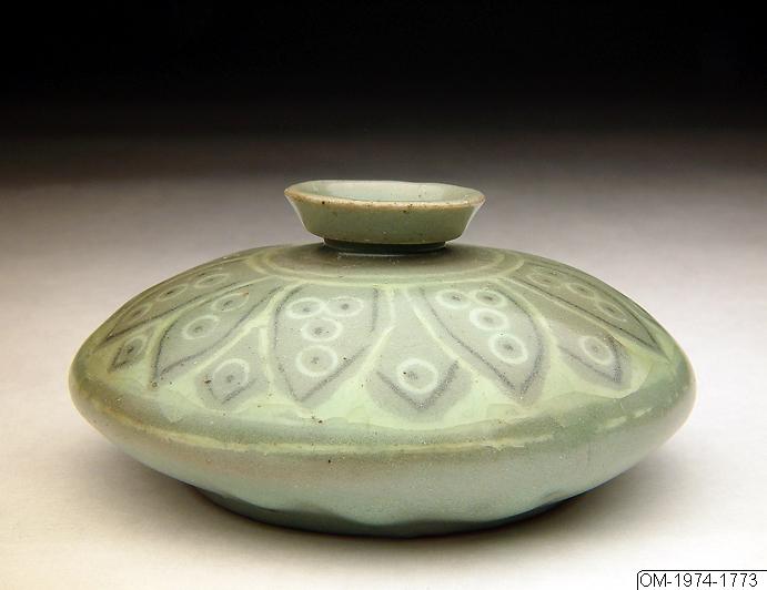 Of globular, squashed shape, this oil bottle has a dish-shaped mouth with a narrow opening and a short neck. The upper half of the body is decorated with a register of lotus petals, framed by a double-line below the neck and a single line at the belly. For this decoration a reversed inlay technique was applied called yeoksanggam, which means that the background was carved away, leaving the lotus petal band in relief, and then filled in with white or black slip to highlight the main motif. The overlapping lotus petals can be divided in an upper row of petals containing four decorative dots (possibly representing dew drops) and a lower row containing only one dot. A greenish-tinged (celadon) glaze has been applied to the surface of the bottle. The scars of three silica chips, which served as firing supports, can be seen on the base inside the footrim. The glaze has long horizontal cracks along the belly. In the Goryeo period (918-1392), small bottles like the one described above held fragrant cosmetic oils that were usually applied to the hair or the body.