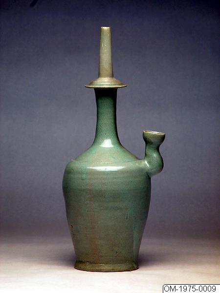 This kundika bottle has a long spout on top that flares into a disk above a long neck. The shoulders slant down to a raised step just above the shoulder. From there, the sides constricts down to a slightly flared foot. The spout on the top was luted to the neck below the disk. An angled spout with a dish-shaped mouth protrudes from the shoulder. This is where the vessel is filled with water. The bottle is undecorated and coated in a bluish-green glaze with a dense crackle. Horizontal fissures along the body that resulted from the potting process were not smoothened out. A deep fissure on the body, along the foot, was probably caused by the trimming the foot. The base and the low footrim are unglazed. This type of vessel originated from India and is commonly called a kundika, which is its Sanskrit name. In Korean, it is called "jeongbyeong." The kundika derived from water bottles used by travelling monks in India and was introduced through China to Korea alongside the Buddhist religion. It served as a Buddhist ceremonial vessel for holding the "pure" water. From the first half of the 12th century the kundika also started to be used as a common water vessel. Kundika bottles were produced in large quantities in ceramics as well as metal. With the spout on the top, the water was filled through the opening at the side.
