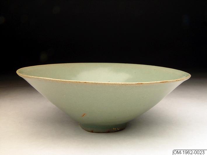 Of conical shape, this bowl has a wide mouth with a slightly everted lip. The sides slant down in a faintly curved line to the narrow, straight foot. The well in the centre of the interior is slightly sunken. The bowl is undecorated and coated with a smooth, greenish-tinged glaze. The glaze coated evenly but shows some pooling below the mouthrim. The foortim shows traces of clay pads that were used to raise the bowl off the firing surface in the kiln. The base inside the footrim is glazed and has a circular indentation along the edge of the rim. This type of bowl was used to drink powdered tea, also known as Macha (Korean: malcha), which was popular among the elite in the early Goryeo period. The tea leaves were ground to a fine powder, and after water was added, whipped until bubbles occurred. The wide mouth and the conic shape of the tea bowl were suitable for the preparation and consumption of this type of tea. The majority of extant early wares of the Goryeo dynasty (918-1392) are tea wares, which is related to the proliferation of tea culture during that time. Tea, as well as tea wares, were introduced to Korea from China. As the demand for tea vessels and utensils increased, the state initiated the local production of tea ceramics, which led to the development of green-glazed celadon wares and white porcelain. Tea drinking was an important aspect of the cultural and social life (of the upper class) and was closely associated with national rituals as well as religious practices and rituals in Buddhism - the state religion of the Goryeo Kingdom.