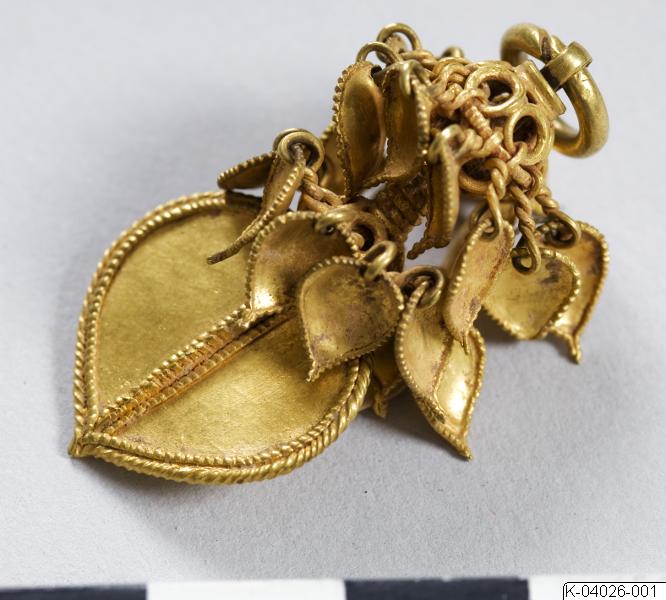 This gold earring consists of a primary pendant in the shape of a leaf surrounded by two tiers of smaller leaves above. A framework of wiring holds together the leaf-shaped sheets of gold. The smaller pieces of gold sheets have a concave shape. The craftsman used tooled details to decorate the edges of the smaller leaves and the axes of the larger leaf as well as twisted wires in the decoration of the outer edges of the larger leaf.