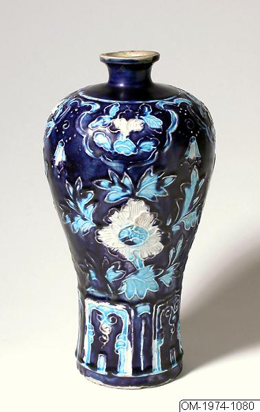 Vas. Fahua-vara. Enligt katalogkort:Balusterformig vas med mörkblå, ljusblå och vit glasyr. Upphöjd dekor i massan. Tillverkningsort: Jingdezhen Vidare info se ÖMs katalogkort.