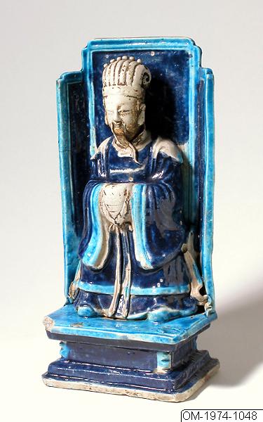• Enligt katalogkort: Sittande figurin föreställande präst (?) med mörkblå och ljusblå enfärgsglasyr.