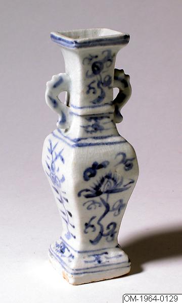 Från fristående monter i Tang-Ming-salen med porslin med dekor i underglasyrblått från Hongwu- (1368-1398) och Yongle-perioden (1403-1424), Ming. Enligt montertext: “Vaser, ett par i fyrkantig balusterform med två flata hänklar. Dekorerade med skissartade lotuskvistar och lingzhi. Tidigt 1400-tal. Lauritzens donation.” Höjd 16,5, bredd 5,5 cm.