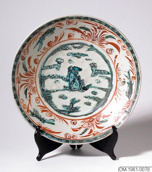 Från fristående monter i Tang-Ming-salen med porslin med emaljfärgsdekor av Swatow-typ från Ming-dynastin (1368-1644). Enligt montertext: “Fat med rundade sidor, mjukt övergående botten. Dekorerad med sittande lejon i landskap, fiskar omgivna av vattenväxter, ytterst vid mynningen rutbård. Dekoren utförd i turkos och tomattrött mot mörk sepia-teckning. Gråvit glasyr:Botten sandbemängd. Gåva av överintendent Åke Wiberg.” Höjd 6,5 cm, diam. 32 cm.