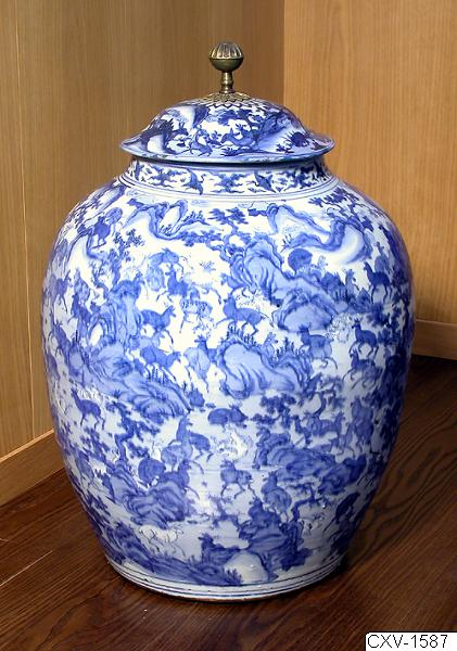 These urns (CXV-1586, CXV-1587), with a blue underglaze décor showing a hundred deer in a mountain landscape, are of good quality craftsmanship and of great cultural-historic value. They represent early acquisition of Chinese porcelain in Sweden and their history reflects the symbolic (and pecuniary) status value of Chinese blue and white porcelain during the 17th century in Europe. The Queen Kristina collection of blue and white porcelain comprised of approximately 300 pieces, out of which only these two urns are known to us today. History of the Object These urns formerly belonged to Queen Kristina (1632 - 1654) who was presented with them by a Portuguese ambassador in the 1640s. Later they formed part of the collection of King Karl XV. (Virtual Collection of Masterpieces, http://masterpieces.asemus.museum/Default.aspx)