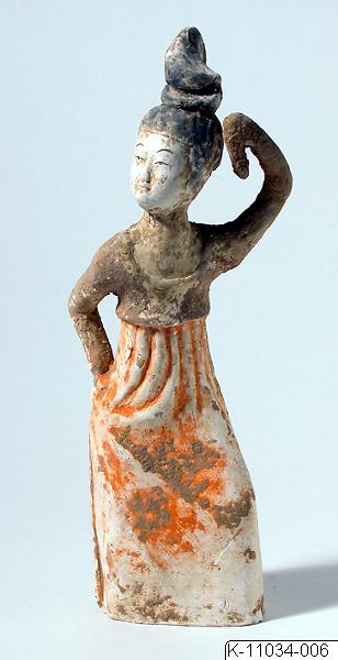 Promenerande kvinna med rund hatt och med en väska som hänger över vänster arm. Ljust lergods med spår av röd och svart bemålning. Enligt K-katalogen “F 6033, Karlbeck nr. 302. liten oglaserad kvinnofigur, danserska. Inköp: Shanghai------(oläsligt)” Höjd: 27 cm.