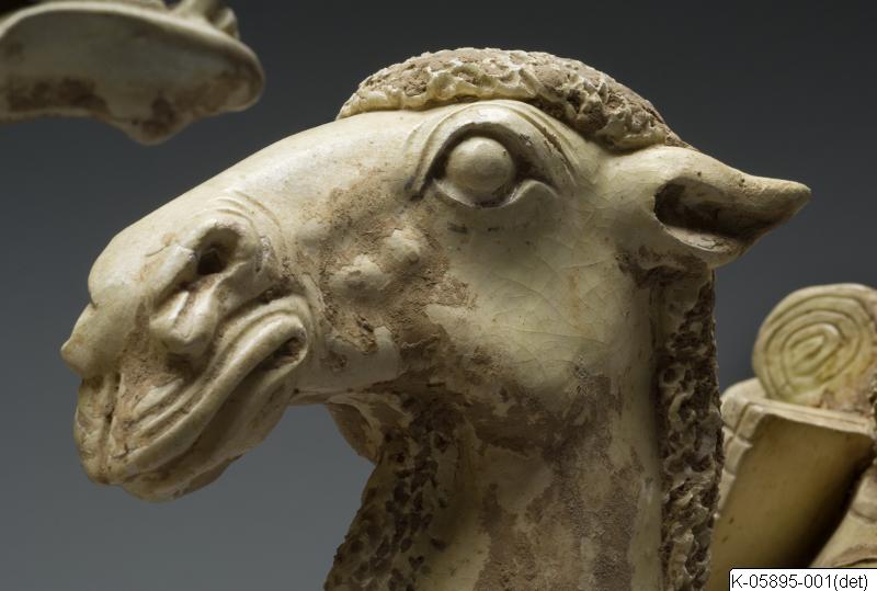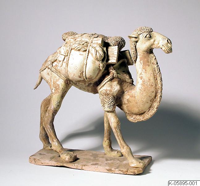 Gravfigurin i lergods från Tang-dynastin (618-906). Enligt montertext: “Kamel med packning. Ljust lergods med halmfärgad glasyr.” Höjd 40 cm, bredd 43 cm.