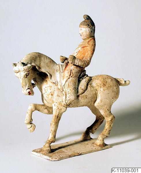 • Ämbetsman till häst. Ämbetsmannen är klädd i röd rock, stövlar och huvudbonad. Rektangulär bas. Ljust lergods med spår av röd och svart bemålning.