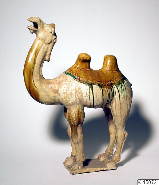Kamel med uppåtböjt huvud och öppen mun. Blyglasyr av trefärgstyp, s.k. sancai. Höjd: 60 cm Längd: 42,5 cm Bredd: 17 cm