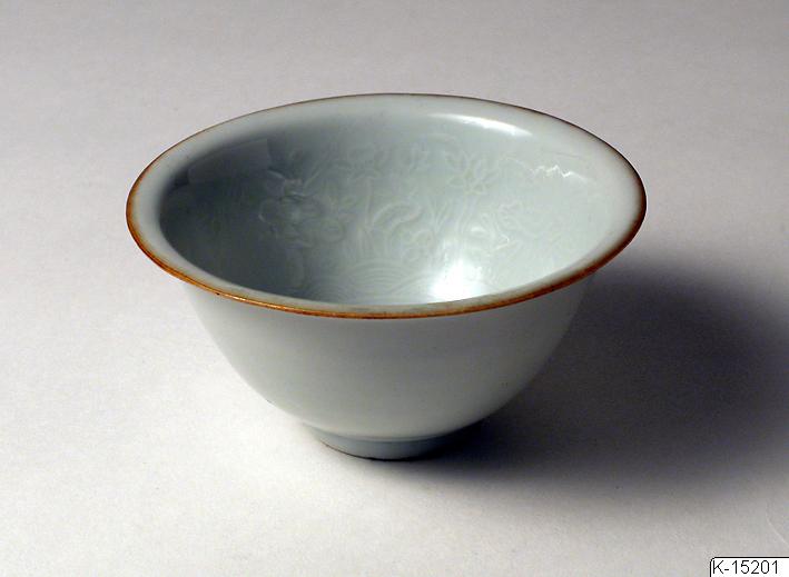 Från underskåp monter 19 i Tang-Ming-salen. Kopp av porslin med s.k. an hua-dekor på insidan av fåglar i lotusdamm. Brun kant. Höjd 5 cm, diam. 9,5 cm.
