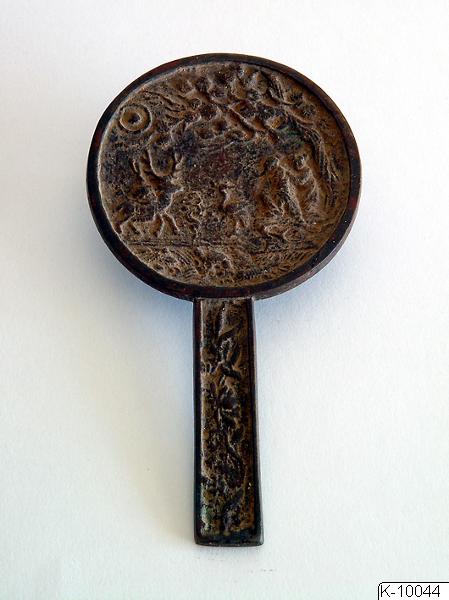 L: 19 cmSpegel med handtag, dekorerad med växt och djurmotiv: hjort, fågel, fisk, sköldpadda.Chihli, Hsuan Hua Hsien, Nan Yu Ko, Shih Kou.