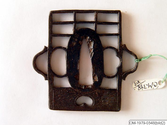 • Tsuba av metall i rektangulär form med genombrutet mönster. Hål för kodzuka och kogai. På klinghålets insida spår av märkning, nummer “150” eller “180”.