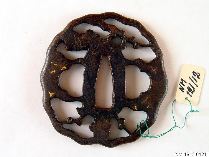 • Tsuba (parerplåt) av metall med dekor av körsbärsblom i positivt genombrutet arbete. Spår av guldinläggningar. Hål för kodzuka och kogai.