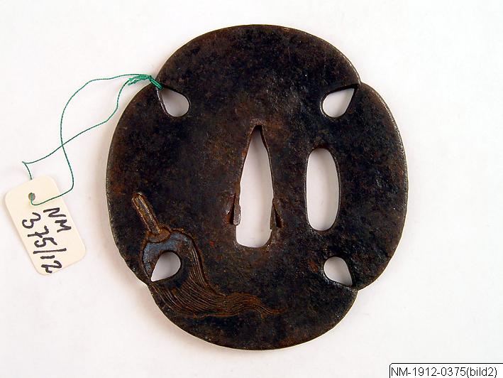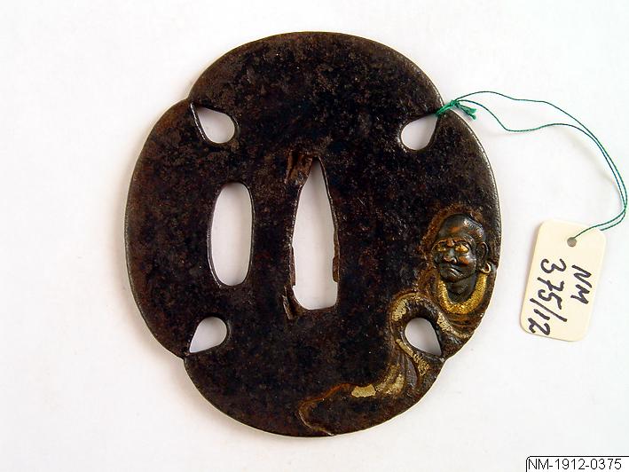 Enligt katalogkort: “Parerplåt, Tsuba av järn, quasimokkoform med två klinghål. På frams. en sittande Dharma, å baks. en vippa. Ciselerat med bronsinläggn. och guldbeläggn. Ej sign.”