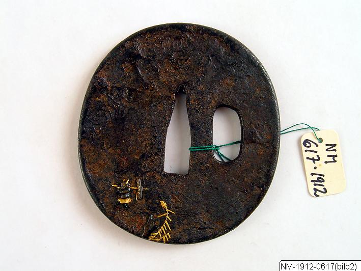 Tsuba (parerplåt) av järn dekorerad med figur till häst ledd av mindre figur i relief med inlagda metaller, bland annat guld. Hål för kodzuka. Enligt katalogkort: “Parerplåt, Tsuba av järn, bred oval, två klinghål. Å frams. en ryttare, vars häst ledes av en liten djävul. Å baks. en liten djävul bärande en stång, ciselerad inlagd relief med brons, guld o.s.v. Skrovlig botten. Ej sign.”