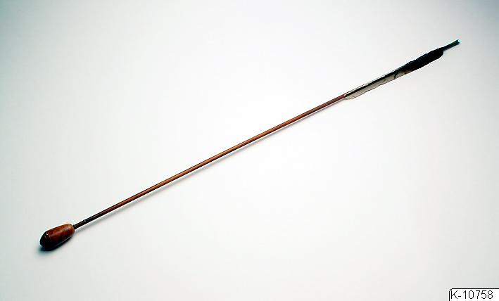 • Pil med fjäderförsett träskaft och klumpformad spets av trä. I spetsen finns fyra stycken inåtgående hål.