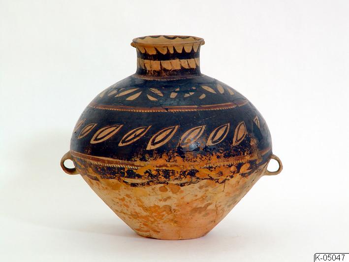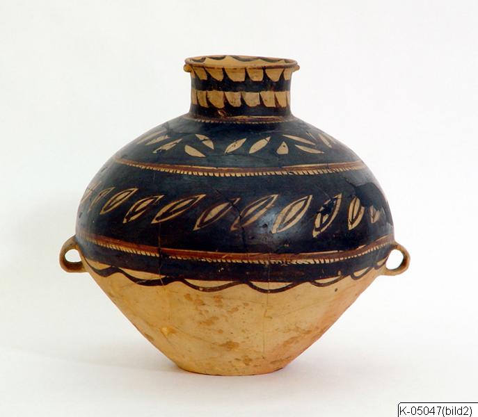Kruka av lergods med målade mönster i svart och violett. Krukan har slagits sönder och restaurerats. På krukans undersida påskriften “Pien Chia Kou Pot 4 (47)”.  Krukan ingår i det gravgods som omgärdat skelettet i montern i stenålderssalen. Tillfälligt placerad i Japan-salen.