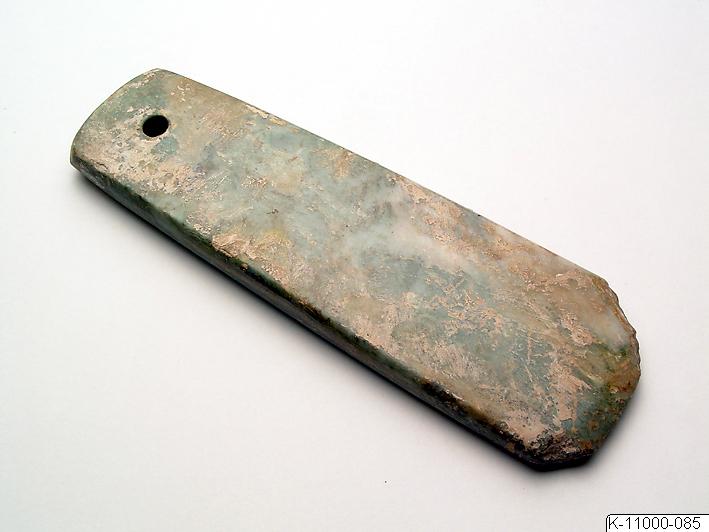 • Föremål av jade, sannolikt en yxa, med ett hål.