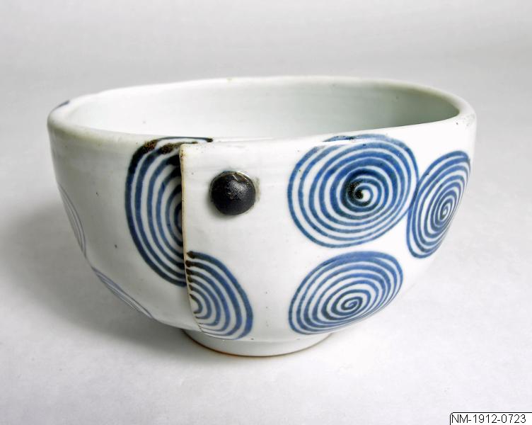 Teskål av glaserat stengods, blå spiralformer på ljust blåvit botten. Oregelbunden form, kanten har innan bränningen skurits upp, lagts omlott och nitats med metallnit. Sannolikt 1800-tal. (Baserad på text från utställningskatalogen Japan. Föremål och bilder berättar. 2011). /PH