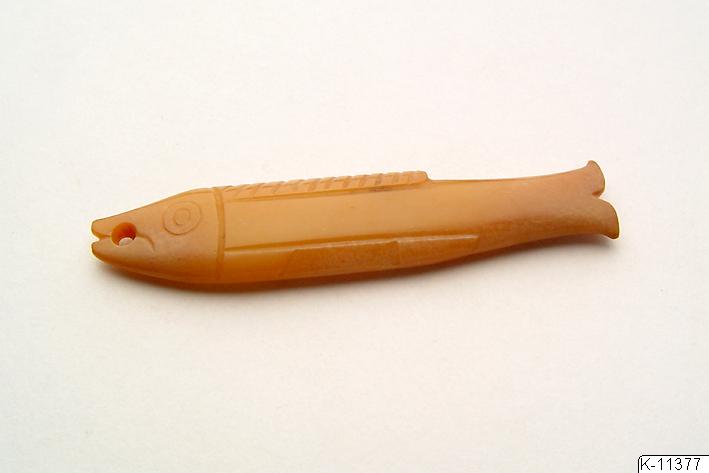 Föremål av jade i form av fisk, med ett hål och inskurna mönster. Från låda märkt “Jader Pre-Han”.