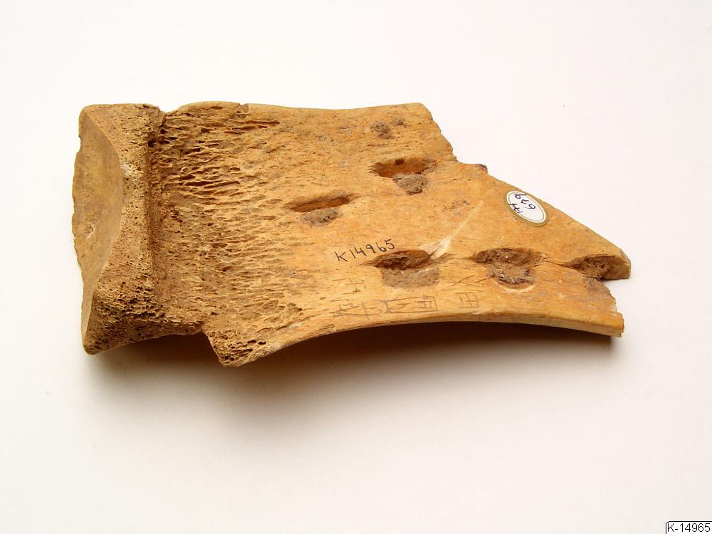 Del av ett orakelben. På ena sidan urgröpningar i benet samt några tecken, på andra sidan inskurna tecken med spår av röd färg. På föremålet finns en ditsatt etikett med påskriften “AH 679”. Från låda...