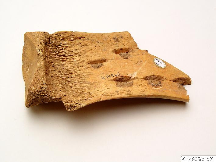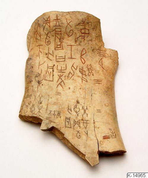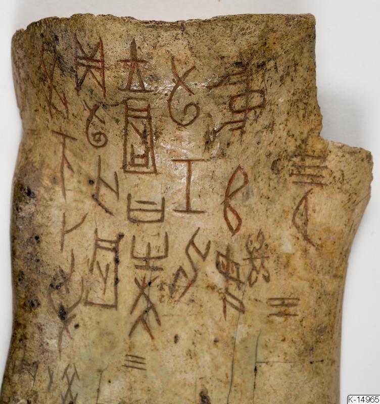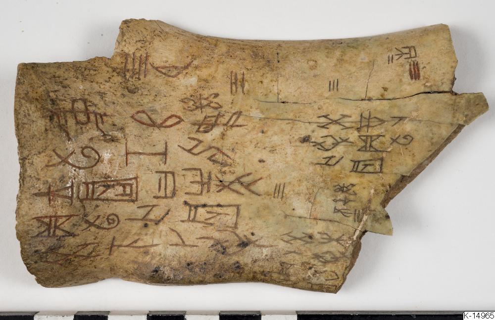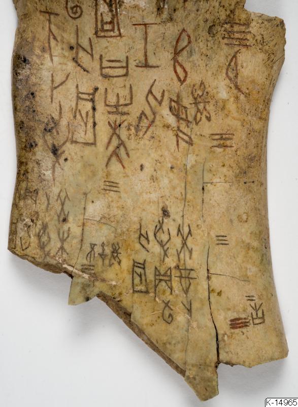 Del av ett orakelben. På ena sidan urgröpningar i benet samt några tecken, på andra sidan inskurna tecken med spår av röd färg. På föremålet finns en ditsatt etikett med påskriften “AH 679”. Från låda märkt “Ben Anyang”. Ee
