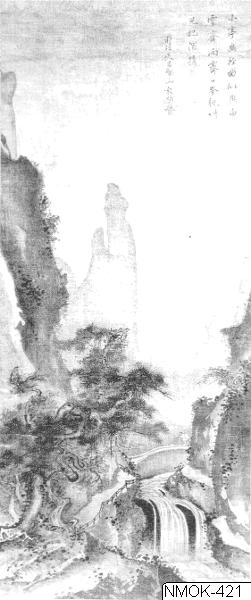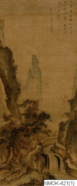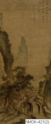 This painting in ink and colour on silk depicts a mountain valley with a stream. The foreground consists of a group of pine trees with twisting branches to the left and parts of a high rock cliff covered with vegetation to the right. Two paths, one on each side of a stream, lead through the valley and draw the eye of the viewer from the foreground to the background, where mountain peaks are rendered in outlined light blue-green and red wash. A figure, carrying containers, probably for wine, on the back crosses a bridge above the stream at the centre of the composition. An inscription, a poem, in four lines with each five characters, is written in the upper right corner of the painting and can be interpreted as: "a small pavilion on a secluded, winding mountain path, levelled with the white clouds; as the rain stops [I] lift [my] gaze and call for the boy to bring wine" (小亭幽径曲 似與白雲齊 雨霽一登眺 呼兒把酒携). Next to the poem, an inscription indicates the identity of the writer: 前住天目聖山無明贊, Wu Ming from the mountain Tianmu (a mountain in eastern China). This inscription is overlapped by a rectangular relief seal. Another rectangular relief seal can be seen in the left lower corner. Both seals are indecipherable. This painting is very similar to one of a pair of hanging scrolls depicting a landscape attributed to the Chinese Song dynasty painter Li Tang held in the Kōtō-in, Kyoto, Japan.