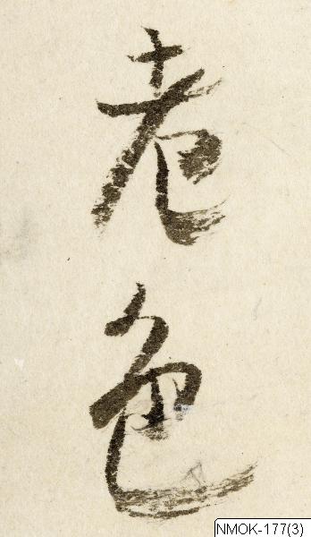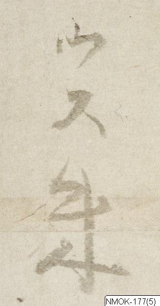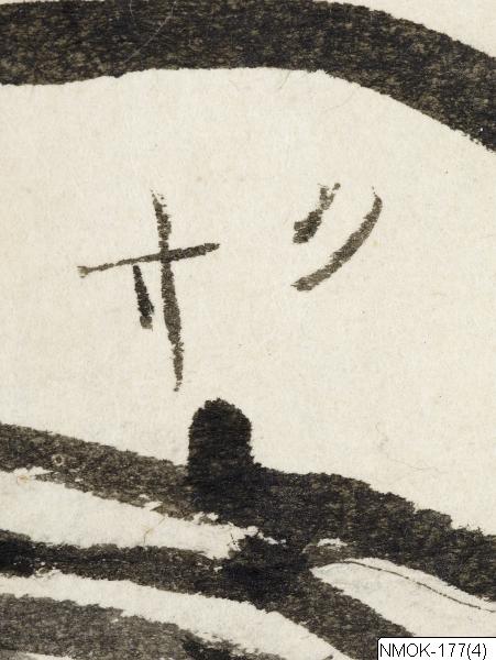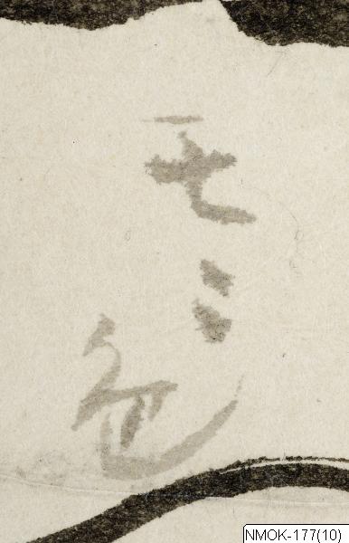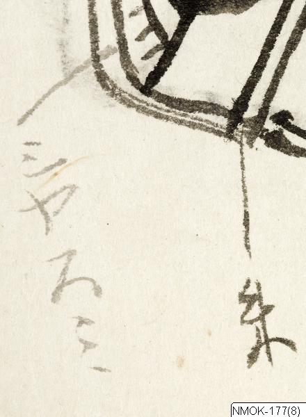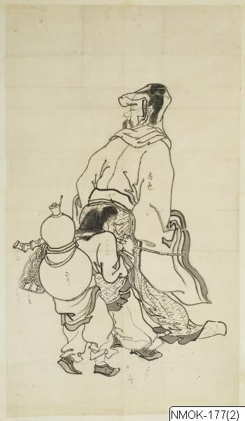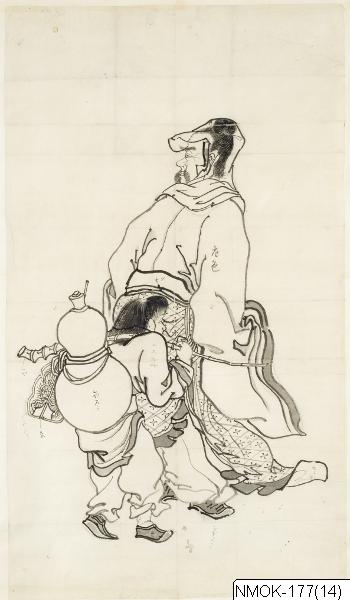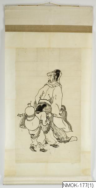 • "En förnäm man, åtföljd av en tjänare som bär en kalebass (hyotan) på ryggen." Sannolikt en taoistisk komposition, kopierad efter en målning ur Tosa-skolan.