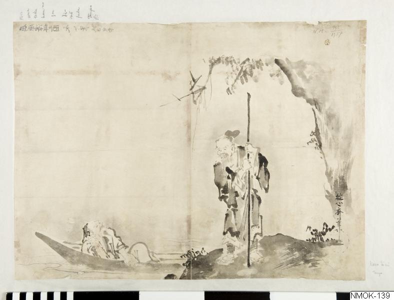 Den ene står på stranden, stödd på en stav under ett framskjutande klipputsprång, den andre ligger i en båt; de syns samtala. Enligt påskrift utförd efter orig...