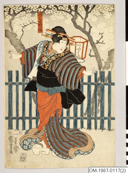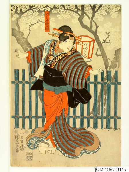 Träsnitt av Utagawa Kuniyoshi (1797-1861). Scen från kabuki: onnagata. Manlig skådespelare i rollen som geishan Izumiya Okuni. Tusch och färger på papper, 1847-50. Eventuellt del av dip- eller triptyk. Efter att ha utövats av både kvinnor och män spelades alla roller av män inom kabuki-teatern sedan mitten av 1600-talet. Kvinnorollsskådespelarna (onnagata) strävar inte efter att "representera" kvinnor ur realistisk synvinkel utan agerar en sorts stiliserad konstruktion med aktörens manliga kropp i grunden. Särskilt kulturen kring den unge pojkens skönhet (bishonen no bi) kan ha spelat in i utformningen av onnagata-konsten. (Baserad på text från utställningskatalogen Japan. Föremål och bilder berättar. 2011). Kabuki-teatern Kabuki-teatern är en av de mest kända teaterformerna i Japan och har ursprung i tidigt 1600-tal. Publiken bestod främst av de välbärgade stadsborna. Under tiden mellan 1603 och 1629 stod främst kvinnor på scenen (onna kabuki). Pionjären Izumo no Okuni framförde i Kyoto och Edo ”excentriska danser” (kabuki odori), ofta i manskläder och med utländska inslag som halsband med kors. Från 1629 förbjöds kvinnor att agera och istället var det främst unga män eller pojkar som uppträdde (wakashu kabuki). Både kvinnorna och de unga männen var ofta involverade i prostitution. Bland annat p g a de många striderna om dem tilläts från 1652 enbart vuxna män med rakad främre del av hjässan att uppträda. Berömda spelstilar för mansroller är en ”överdriven”, kraftfull spelstil (aragoto) och en mjukare, mer realistisk stil (wagoto), ursprungligen från Kansai, d v s området kring Osaka. De män som specialiserade sig på kvinnoroller kallas onnagata (oyama), de män som spelar män tachiyuki eller tateyaku. Dockteatern (bunraku eller joruri) och kabuki-teatern påverkade varandra ömsesidigt från sent 1600-tal. En av Japans mest kända pjäsförfattare, Chikamatsu Monzaemon (1653–1724) skrev pjäser för både dockteatern och kabuki. 2005 utnämnde UNESCO kabuki till ”Masterpiece of Oral and Intangible Heritage of Humanity” inom kategorin “Intangible Cultural Heritage”. Kabuki är bland mycket annat känd för sin tidigt relativt tekniskt avancerade scenteknik. Bland annat kan nämnas maskineri som gjorde det möjligt för aktören att snabbt dyka upp på olika ställen och vridscenen (mawaributai) som uppfanns 1758 och som gjorde snabba scenbyten möjliga. Själva föreställningarna var på dagtid eller så länge det fanns tillräckligt med ljus. Redan före kl 7 på morgon var en vanlig starttid, vilket gjorde att en del i publiken övernattade i närheten för att kunna få bra sittplatser. Priset på biljetter varierade kraftigt och berodde på skådespelarnas popularitet och en utbredd stjärnkult. På kabuki-scenerna syntes förr både dagsaktuella och historiska ämnen. För att undgå censuren förkläddes samtida dramer med samurajroller till historisk tid eller ”fiktiviserades” (personerna gavs t ex andra namn än det verkliga, även om betraktaren förstod vem som avsågs). Ett exempel på det är en välkänd kabuki-pjäs, Kanadehon Chushingura, ibland kallad ”De 47 herrelösa samurajerna (ronin”). Chushingura är fortfarande tema för årliga TV-produktioner och filmer. Den baseras på en verklig händelse från omkring år 1700 och förlades till tidig Muromachi-period (1392–1573) för att undgå shogunatets censur. Inte sällan fick teatrar stängas efter censur och antalet teater-byggnader kontrollerades. Kabuki-dramerna var en kommenterande observatör av det samtida nöjeslivet, men även en kritiker av det pågående militära styret. (Baserad på text från utställningskatalogen Japan. Föremål och bilder berättar. 2011, s 55, 62). /PH
