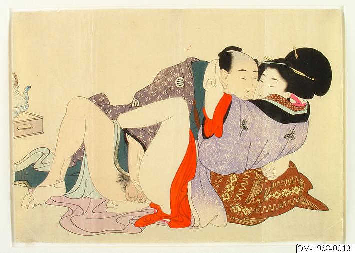 Erotiskt träsnitt (shunga). Osignerat, Ikeda Terukata, ca 1905. Lik https://www.britishmuseum.org/collection/object/A_OA-0-115 utom bl a i färgerna. No.11 (Higashioji) / Komachi-biki (Tugging Komachi) Ikeda gjorde flera parafraser på denna serie av Utamaro.