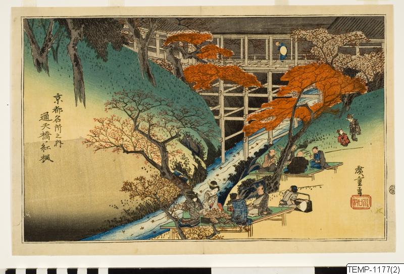 Röda lönnar vid Tsūten-bron vid Tōfukuji, träsnitt ur serien Berömda vyer av Kyōto (Kyōto meishō). Firande av de röda lönnlöven (momijigari). Utagawa Hiroshige (1797-1858). Ca 1835. Vår och höst firar man gärna i Japan med picknick under blommande (körsbärs-)träd respektive rodnande (lönn-)löv. Lönnlöven uppmärksammas och hur deras färg skiftar över landet, den s k "höstfärgsfronten" (koyo zensen) följs noggrant. (Baserad på text från utställningskatalogen Japan. Föremål och bilder berättar. 2011). /PH