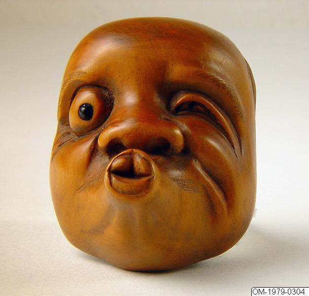 • Netsuke i form av teatermask med ett komiskt ansikte (Hyottoku i kyogen). Osignerad. 1800-tal.