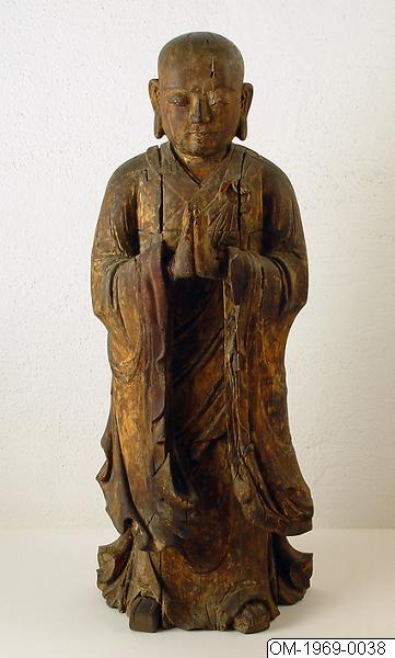 Skulptur av trä föreställande munk med händerna i böneställning. Svaga spår av röd lack och guldlack. I ryggen på skulpturen finns en lucka, locket till luckan förvaras löst tillsammans med föremålet. Innanmätet i skulpturen som legat innanför luckan förvaras i en glasklar akryllåda löst tillsammans med föremålet. Skulpturen har en del sprickor. Enligt utställningsetikett: “Stående munk med händerna i böneställning (sannolikt Buddhas lärjunge Ananda). Trä med spår av guldlack. 1600-tal. Testamentarisk gåva av C. G. Lindgren”. Enligt Statens konstsamlingars tillväxt och förvaltning 1969: “Munk stående med händerna i böneställning. Trä m spår av färg. Ming Gåva enl testamente av hovrättsnotarie C. G. Lindgren”.
