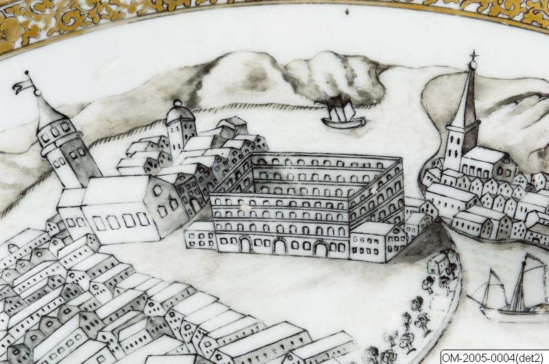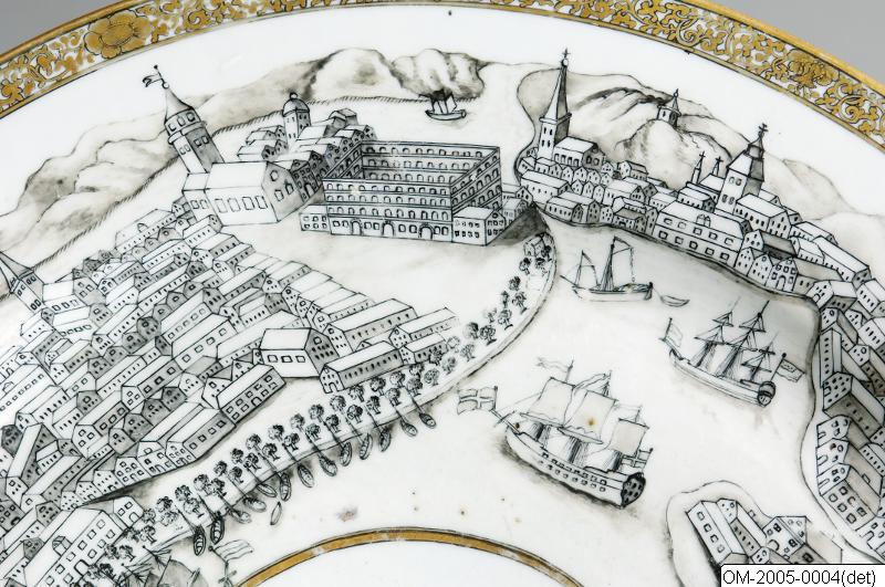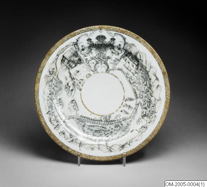 Fat, vapenporslin. Dekor i grisaille och guld av Svenska Riksvapnet och vyer över Stockholm, Gamla Staden med Storkyrkan, Norrmalm med Jakobskyrkan och Hedvig Eleonora, Kastellet samt Södermalm med Katarina kyrka. På redden svensk ostindiefarare och holländska skepp. Kantlagning.