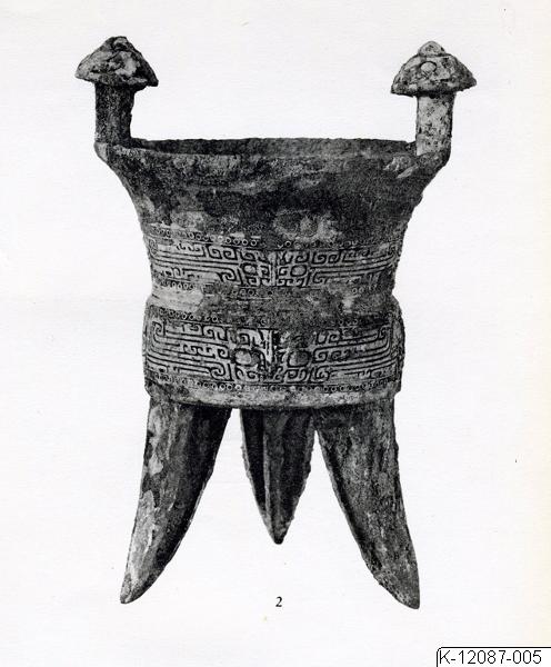 7. Jia – kärl för rusdryck på tre ben. Utsvängd mynning, konvex kjol och flat botten, samt handtag och två raka ståndare. Brons Jia - sacrificial vessel for alcoholic beverages. Bronze Shang, tidig Anyang-period, 1200-talet f Kr. Inköpt av O. Karlbeck i Kina 1934/35. K-12087-005