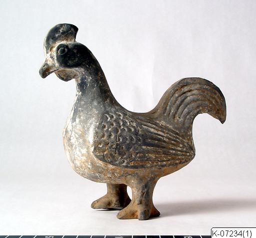 Figurin av lergods, gravgods, gestaltande en tupp. V Jin-dynastin, 265-317 e.Kr. Huai-flodens dalgång, Anhui-provinsen. Inköpt i Kina av O. Karlbeck före 1933, K-07234.