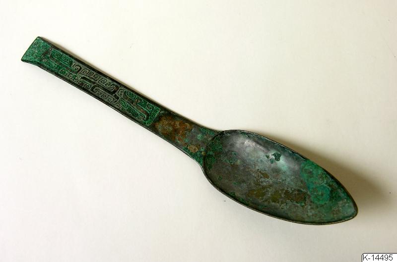Bi – sked av brons. Skaftet med stiliserat drakmotiv samt taotie Bi – spoon. Bronze. The shaft decorated with stylized dragon and taotie VÄSTRA ZHOU (CA 1050-771 F KR). ANDERS HELLSTRÖMS SAMLING.