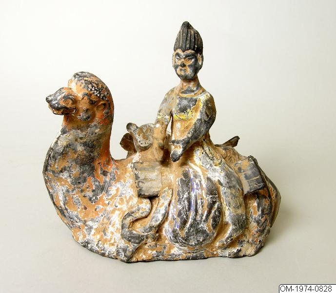 • Figurin av lergods, gravgods, gestaltande liggande kamel med manlig ryttare.