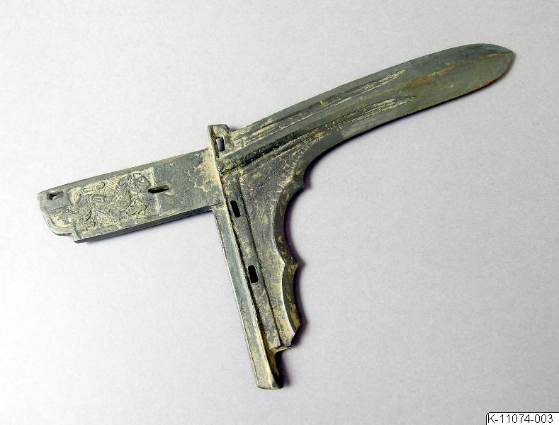 Dolkyxa (ge) av brons med ingraverad dekor av tiger Bronze dagger-axe (ge), with engraved decoration of tiger Stridande staterna (475-221 f Kr). K-11074-003