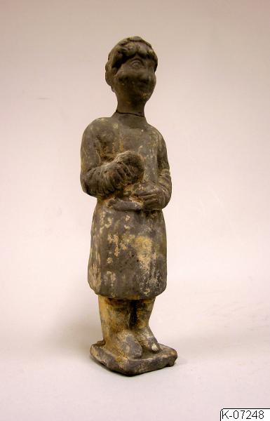 Figurin av lergods, gravgods, gestaltande man från väster. Spår av bemålning. Tang-dynastin, 618-906 e.Kr. Från Huai flodens dalgång, Anhui-provinsen. Inköpt av O. Karlbeck. K-07248.