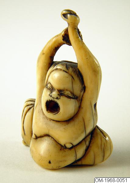 Netsuke of ivory in the shape of Okame dancing a burlesque dance. Signed. The kimono having no pockets, accessories have to be carried somehow. Women could put small objects in their sleeves and sash, whereas men, mainly, would hang their various boxes, pipes and brush cases on a cord at their belt. The portable objects are called sagemono. Accessories became identity-forming status objects and an important part of men´s fashion, a world in miniature with a wealth of subjects. Various kinds of artistically crafted sagemono are known from the 17th century. In addition to boxes for tobacco, cases for personal seals (inro) are one of the best-known types. Literally translated, an inro is a basket (ro) containing a seal (in). Only sealed signatures were legally valid, and so samurai and merchants, for example, needing seal stamps had to carry them in small cases. This was the origin of “seal baskets” (inro), which soon came to be used primarily for carrying medicine. These accessories varied in appearance according to the wearer’s taste and wealth, as well as fashion trends. When Western dress became popular during the Meiji period (1868-1912), there was less need for these portable objects, and they were divided up into their constituent parts (with toggles kept apart) and sold to westerners. (Based on the text for the exhibition catalogue Japan. Artefacts and images tell the story. 2011). The function of the netsuke item is to be a counterweight to the "hanging things" (sagemono) worn with the kimono by the men. Common hanging items were various boxes, for example medicine boxes (inro) and tobacco pouches. Netsuke roughly means "fixed root" and early netsuke (before the late 17th century) were probably natural, unprocessed roots and the like. From the 18th century they were made more representative and often in wood or ivory. Eventually, the artists began to sign their netsuke. (Based on the text for the exhibition Japan. Artefacts and images tell the story. 2011). /PH